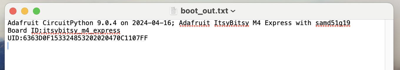 boot_out.txtfile. you should see something likeAdafruit CircuitPython 9.0.4this is the version of CircuitPython you are now upgraded to.