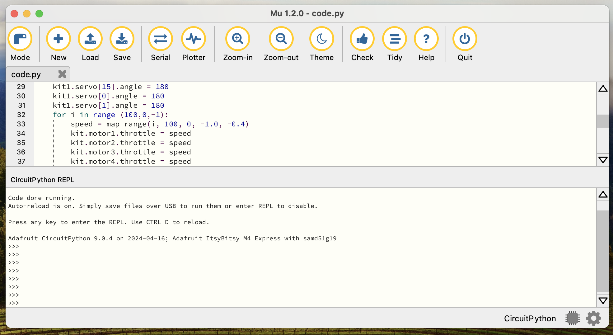 - Open MU editor, press the serial button, and in the REPL you should also see your version of CircuitPython printed.