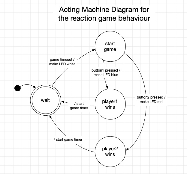 In this week’s assignment we are going to build a simple reaction game. The game consists of two players who wait for a trigger signal after which the first one to push the button is the winner of the game.